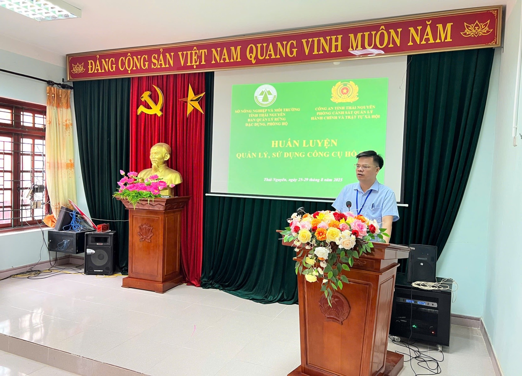 Thực hiện nhiệm vụ quản lý, bảo vệ và phát triển rừng theo quy định của Luật Lâm nghiệp năm 2017, nhằm đáp ứng yêu cầu trong việc thực hiện nhiệm vụ quản lý bảo vệ rừng, đảm bảo việc sử dụng công cụ hỗ trợ của lực lượng chuyên trách bảo vệ rừng của đơn vị theo đúng quy định của Pháp luật, từ ngày 27/8/2025 đến ngày 31/8/2025, Ban Quản lý rừng đặc dụng, phòng hộ tỉnh Thái Nguyên đã phối hợp với Phòng Cảnh sát Quản lý hành chính về trật tự xã hội - Công an tỉnh Thái Nguyên đã tổ chức huấn luyện nghiệp vụ quản lý nơi cất giữ vũ khí, công cụ hỗ trợ cho lực lượng chuyên trách bảo vệ rừng thuộc Ban quản lý. Đây là hoạt động thiết thực, góp phần đảm bảo an toàn trong thi hành nhiệm vụ, đồng thời nâng cao hiệu quả trong công tác quản lý, bảo vệ rừng và phòng cháy chữa cháy rừng.